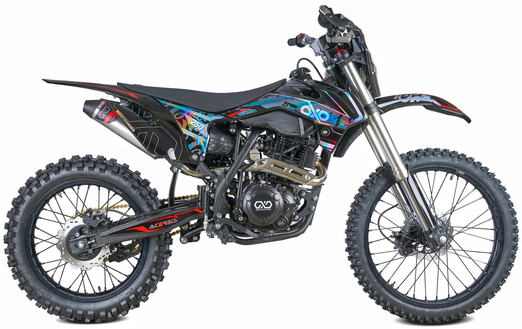 В переднем и заднем колесах установлены антибуксаторы, которые притягивают покрышку к ободу, позволяя ездить по бездорожью при низком давлении в камерах, не давая покрышке проворачиваться во время езды. Размер передней покрышки: 80/100-21. Размер задней покрышки: 120/100-18. Они прекрасно себя ведут по песку и грязи, что позволяет райдеру отлично показать себя на пересеченной местности.